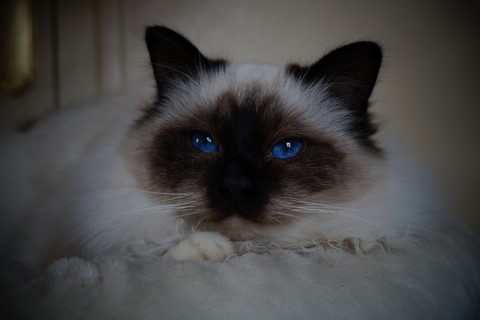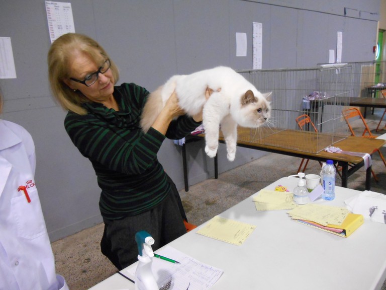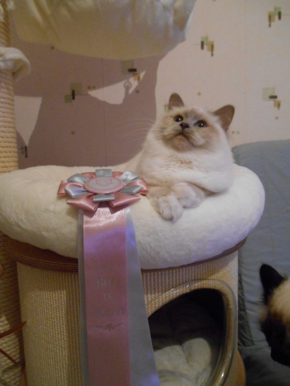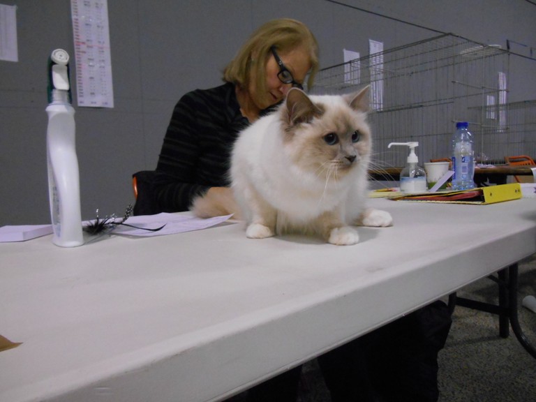 Deuxième exposition féline à Paris Vincennes (c'est parti) ; tu es agé de plus d'un an le parcours commence pour les premiers CAC une très forte concurrence se présente, plus de sept birmans dans ta couleur et dans ta classe . Les regards se posent sur nous; les juges et les éleveurs. Je crois qu'ils parlent de nous Lover, enfin surtout de toi car tu es la vedette. Tu ne penses qu'à faire des calins pendant les jugements. Dailleurs chaque cartons le confirme car les juges mentionnent «gentil caractère» , « garçon equilibré ». Qui remporte le premier prix sur sept birmans ? C'est toi ! Oh mon loulou comme je suis fière de toi. Je n'y crois pas . Je commence grâce à toi a me faire une place dans ce monde si particulier... Tout à coup je ne suis plus une petite éléveuse insinifiante à leur yeux , car tu les intérressent....Par ton magnifique contraste, tes grand yeux bien bleu foncés,ton profil , ton côté massif et musclé , tes petites oreilles bien placées.